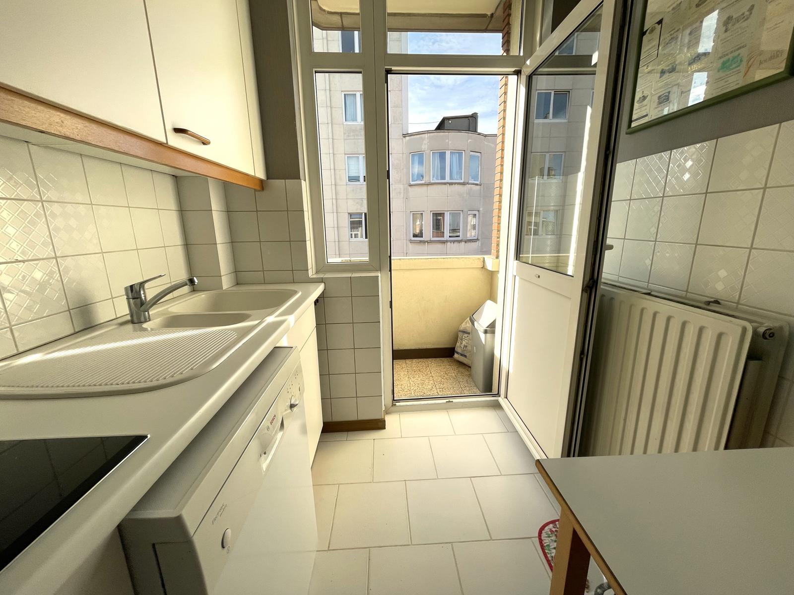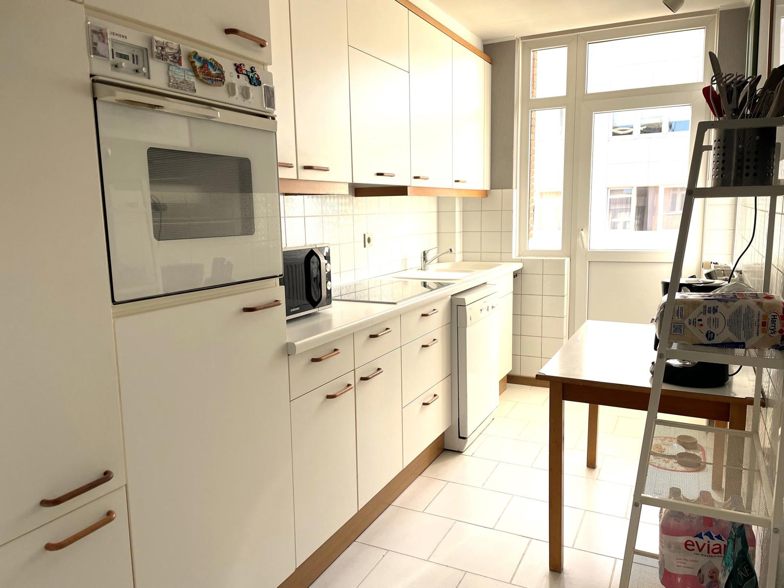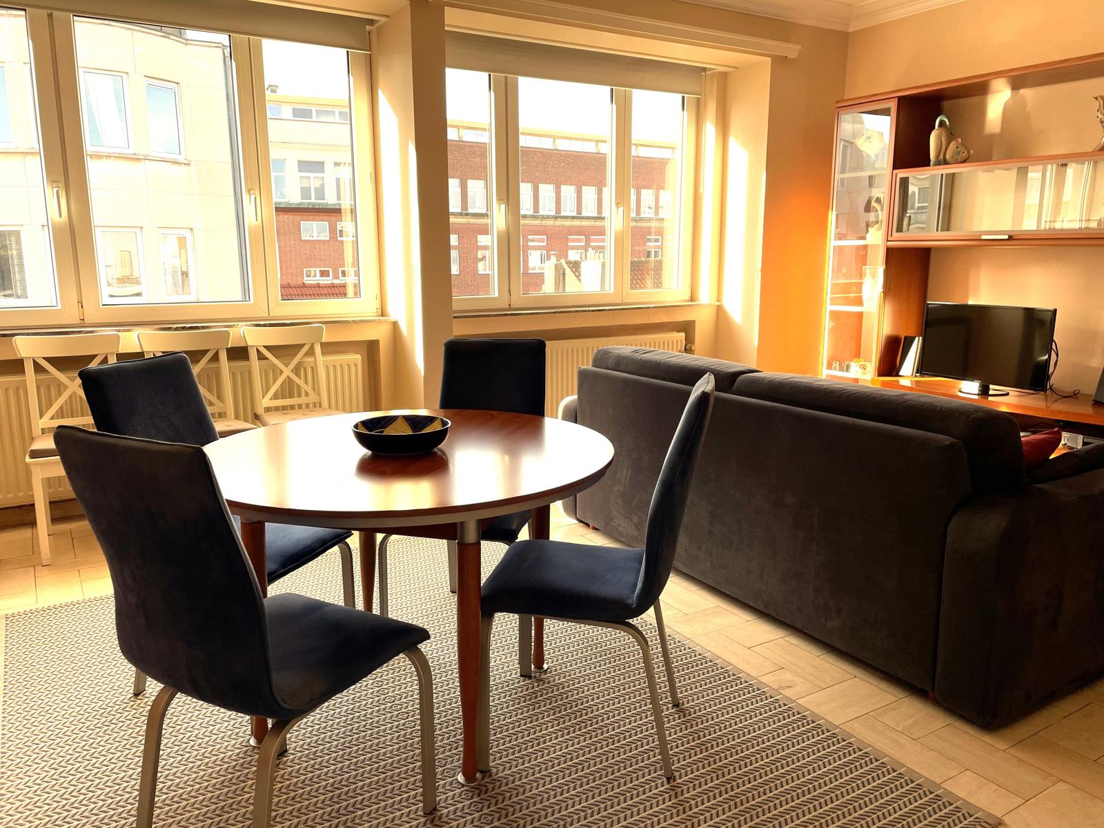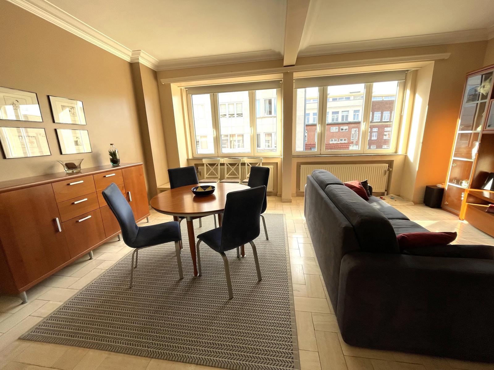 Situé au 4 ème et dernier étage d'un petit immeuble de 1954 bien entretenu, dans le quartier Plasky proche des institutions Européennes et de toutes les commodités,lumineux appartement se présentant ainsi:vaste hall d'entrée, vaste living coté rue,cuisiné équipée et son balcon,w.c. séparé,salle de bain (douche,vasque,coin buanderie), à l'arrière,au calme,deux belles chambres de 16m² dont une avec terrasse de 6m².