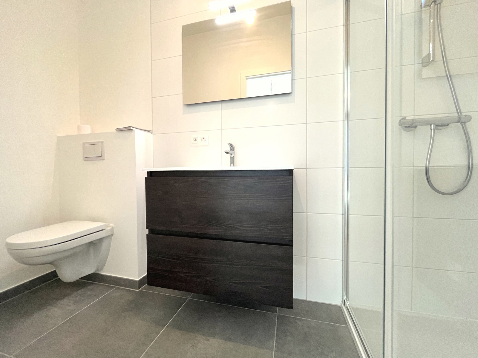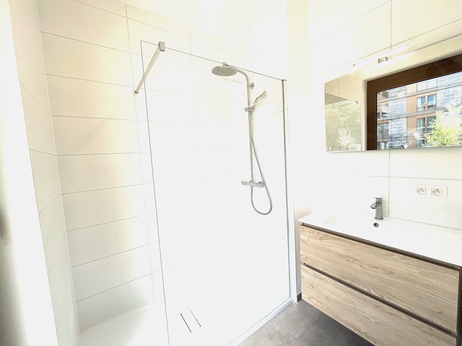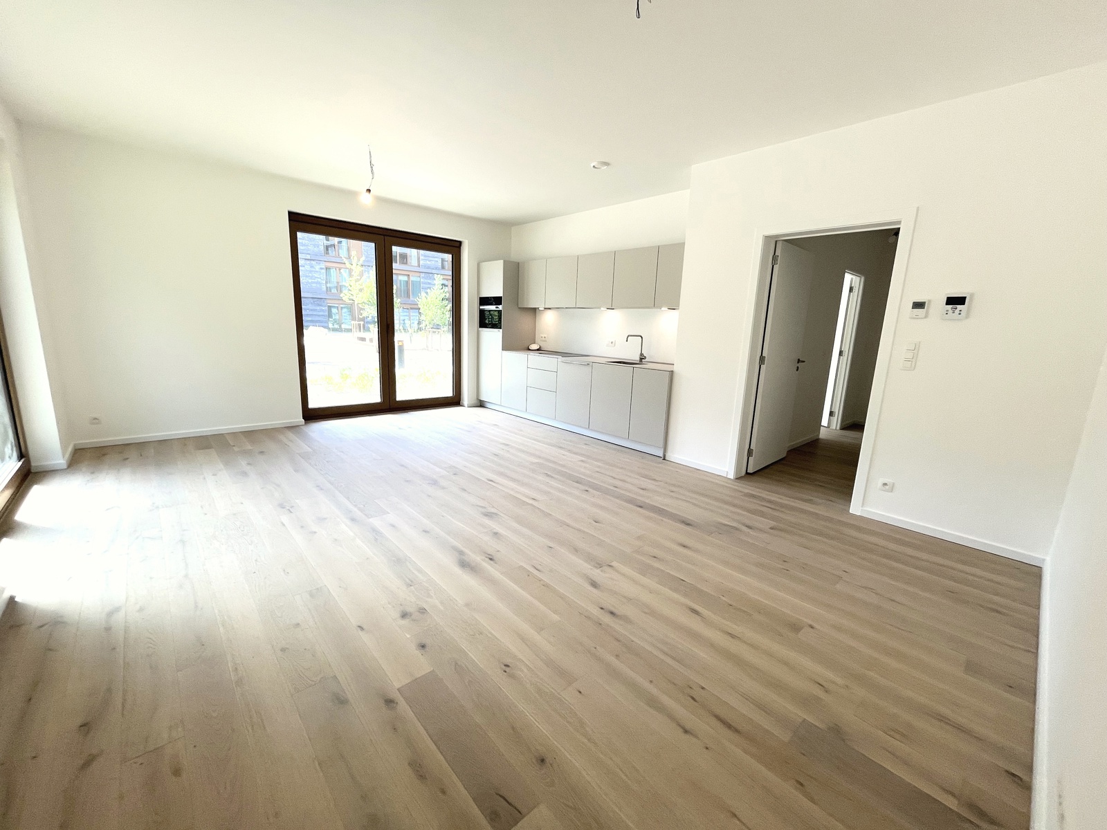 dans un bel immeuble tout neuf conciliant modernité et tradition appartement de standing, jamais occupé, situé au rez de chaussée et se présentant ainsi:hall d'entrée,wc invité,chambre avec sa salle de douche attenante,vaste living et cuisine USA Bulthaup,grandes baies vitrées s'ouvrant sur l'extérieur,2 ème chambre à coucher et sa salle de douche (vasque,douche à l'Italienne,wc),pièce buanderie.