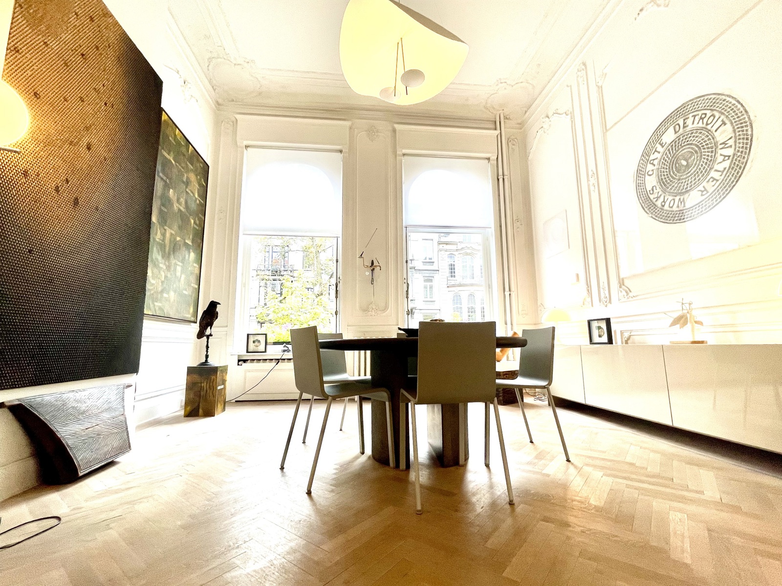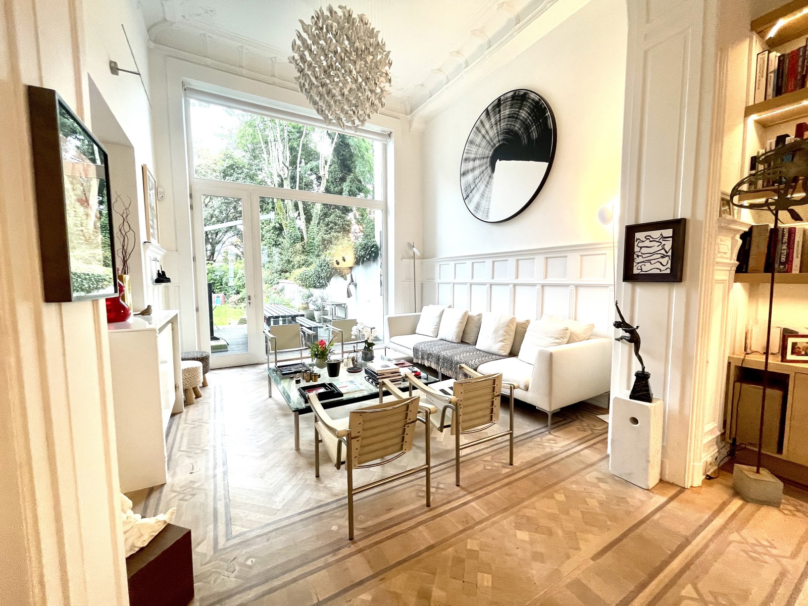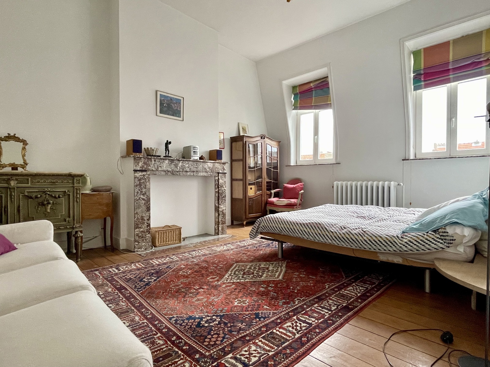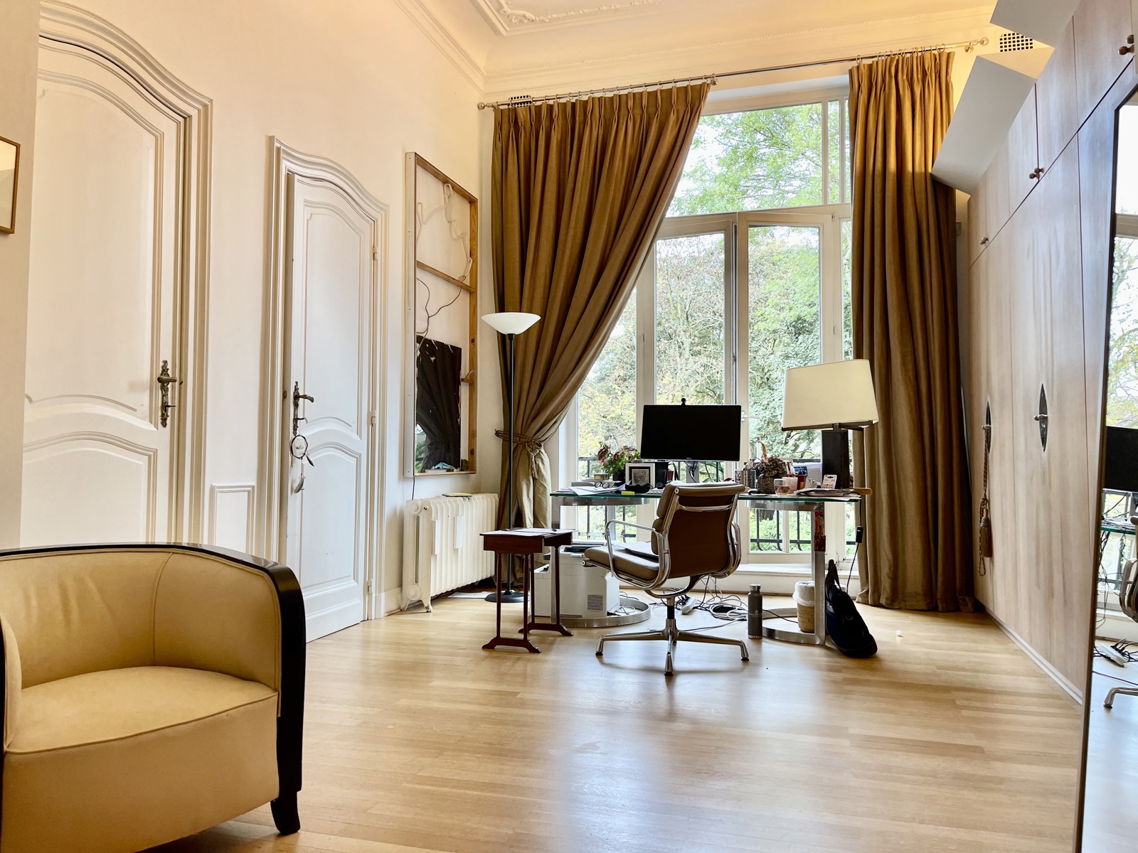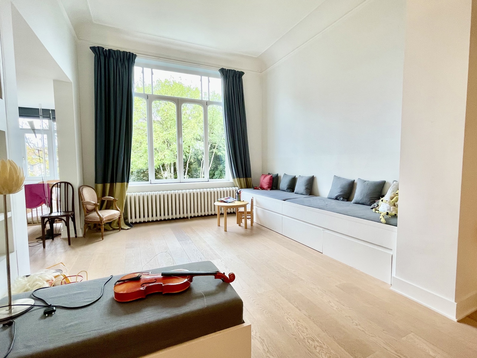 Superbe maison de maître "Beaux Arts" de 1912 idéalement située dans le très prisé quartier d'Ixelles "Brugmann" sur une prestigieuse avenue arborée avec promenade centrale. Elle possède une terrasse et un très beau jardin ainsi qu'un garage. La maison a bénéficié d'une magnifique rénovation de qualité. Actuellement 5 chambres mais possibilité de nombreux changements de par ses 430m2 habitables. Les éléments ornementaux qualifiants une maison de maître d'époque ont été entretenus et magnifiés (parquet chêne, huisseries, plafonds à encorbellements et moulures,cheminées en marbre,,..) Entrée par un bel hall d"entrée en marbre avec une magnifique hauteur sous plafond(moulurés). A ce niveau vous accédez aux 3 grandes pièces inondées de lumiere. Meubles intégrés contemporains en chêne ,bibliothèque etc..Le charme d'antan associé à la modernité et au bon gout en font un coup de coeur prêt à y habiter. Trois grandes pièces en enfilade donnant accès à la large terrasse et au jardin sans vis à vis direct. Egalement une belle cuisine Bulthaup hyper équipée avec électroménagers Miele et ilot de cuissons. Elle benéficie également d'une vue sur le jardin paysagé L'étage suivant est constitué d'un très vaste salon donnant sur l'avenue, de la master room, d'un grand bureau donnant vue sur le jardin ainsi que d'une salle de bain. le dernier étage offre encore 3 chambres, un bureau,parquet chêne, salle de bain. Encore un étage avec deux chambres ainsi qu'un grenier avec mezzanine. Possibilité de mettre en oeuvre un permis accepté en 2016 afin de faire un appartement des deux derniers étages avec terrasse. PEB D Chaudière à condensation récente, alarme, etc