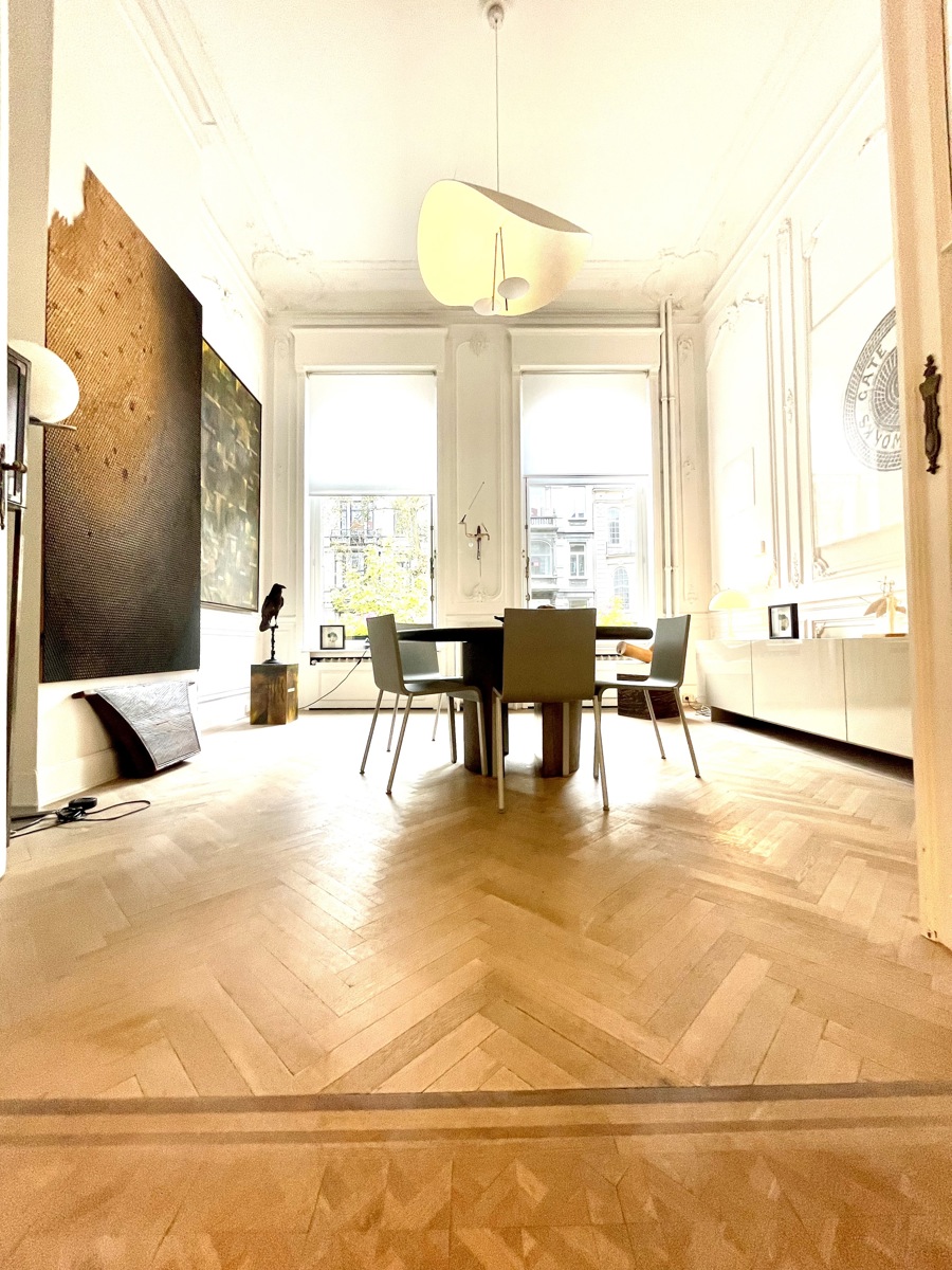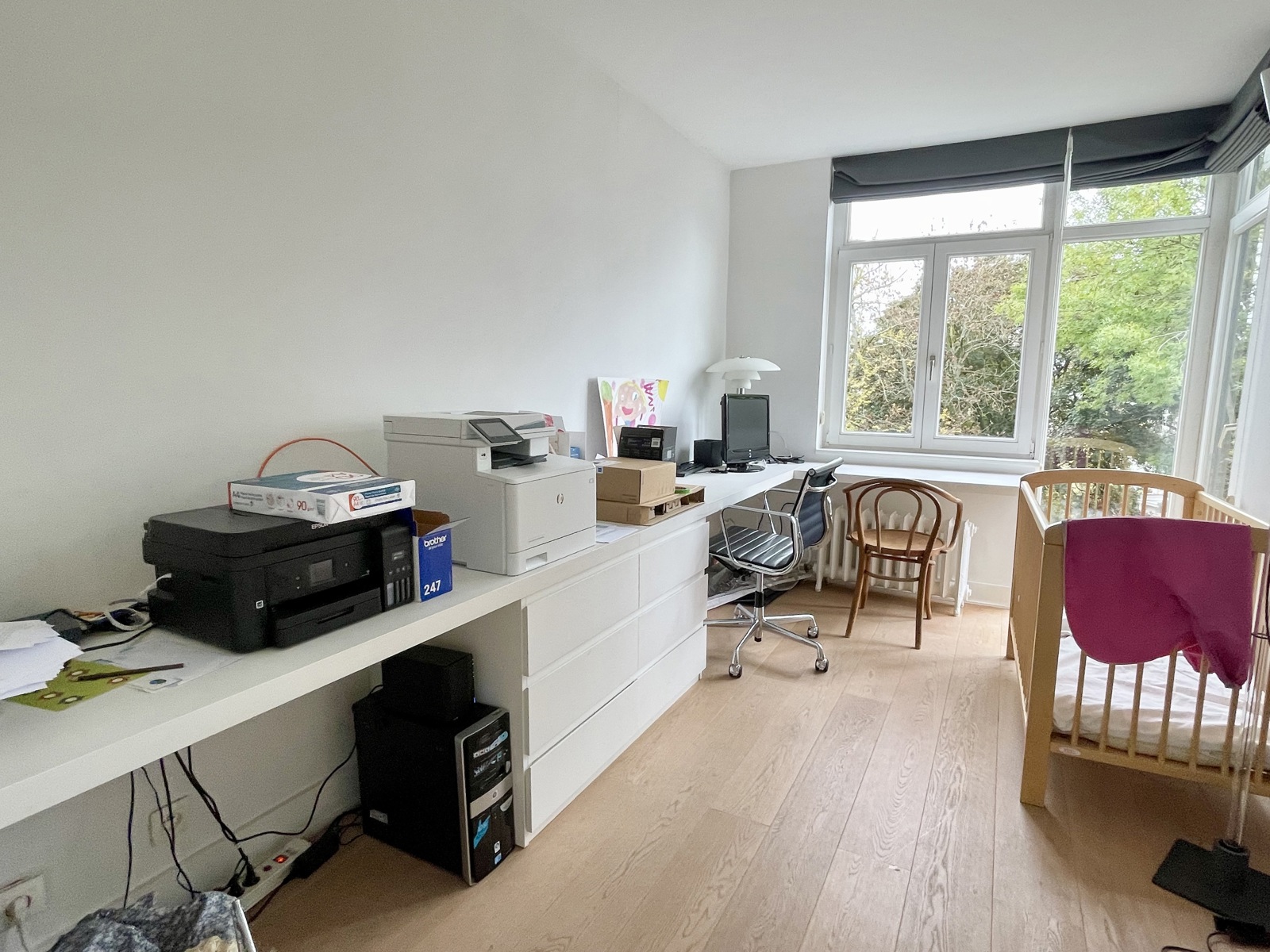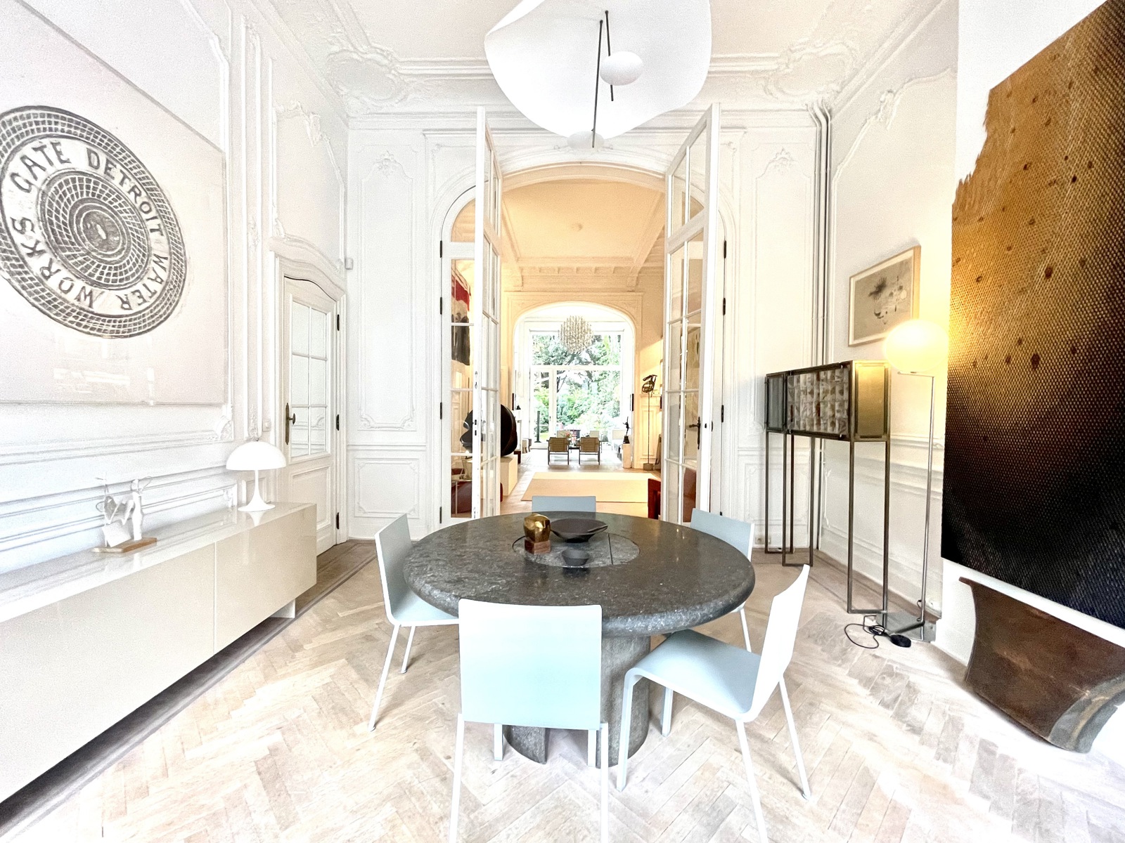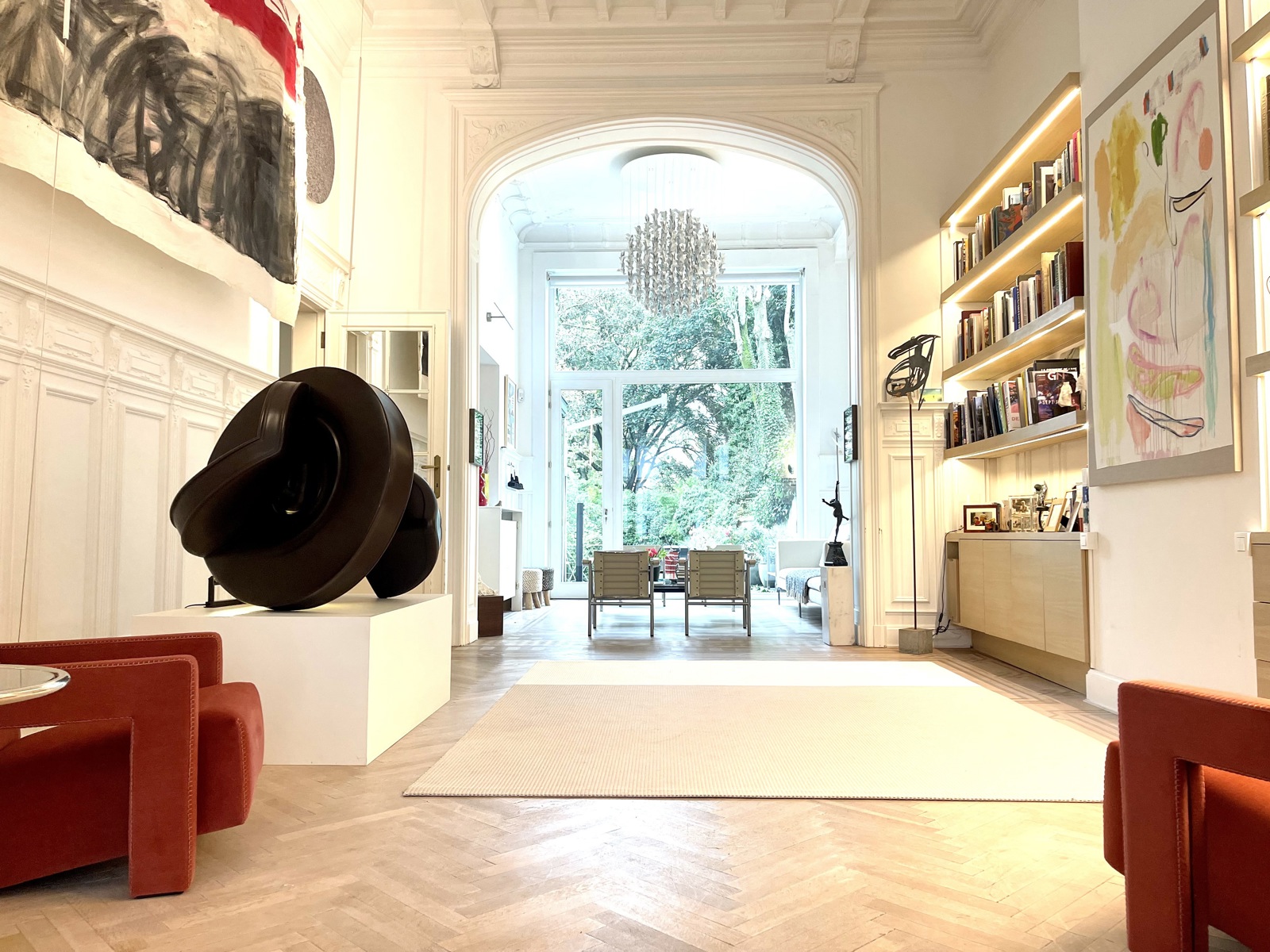 Superbe maison de maître "Beaux Arts" de 1912 idéalement située dans le très prisé quartier d'Ixelles "Brugmann" sur une prestigieuse avenue arborée avec promenade centrale. Elle possède une terrasse et un très beau jardin ainsi qu'un garage. La maison a bénéficié d'une magnifique rénovation de qualité. Actuellement 5 chambres mais possibilité de nombreux changements de par ses 430m2 habitables. Les éléments ornementaux qualifiants une maison de maître d'époque ont été entretenus et magnifiés (parquet chêne, huisseries, plafonds à encorbellements et moulures,cheminées en marbre,,..) Entrée par un bel hall d"entrée en marbre avec une magnifique hauteur sous plafond(moulurés). A ce niveau vous accédez aux 3 grandes pièces inondées de lumiere. Meubles intégrés contemporains en chêne ,bibliothèque etc..Le charme d'antan associé à la modernité et au bon gout en font un coup de coeur prêt à y habiter. Trois grandes pièces en enfilade donnant accès à la large terrasse et au jardin sans vis à vis direct. Egalement une belle cuisine Bulthaup hyper équipée avec électroménagers Miele et ilot de cuissons. Elle benéficie également d'une vue sur le jardin paysagé L'étage suivant est constitué d'un très vaste salon donnant sur l'avenue, de la master room, d'un grand bureau donnant vue sur le jardin ainsi que d'une salle de bain. le dernier étage offre encore 3 chambres, un bureau,parquet chêne, salle de bain. Encore un étage avec deux chambres ainsi qu'un grenier avec mezzanine. Possibilité de mettre en oeuvre un permis accepté en 2016 afin de faire un appartement des deux derniers étages avec terrasse. PEB D Chaudière à condensation récente, alarme, etc