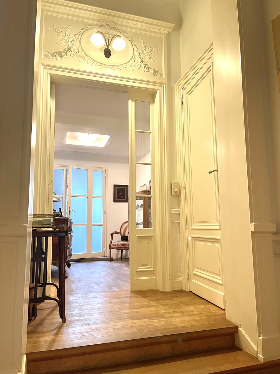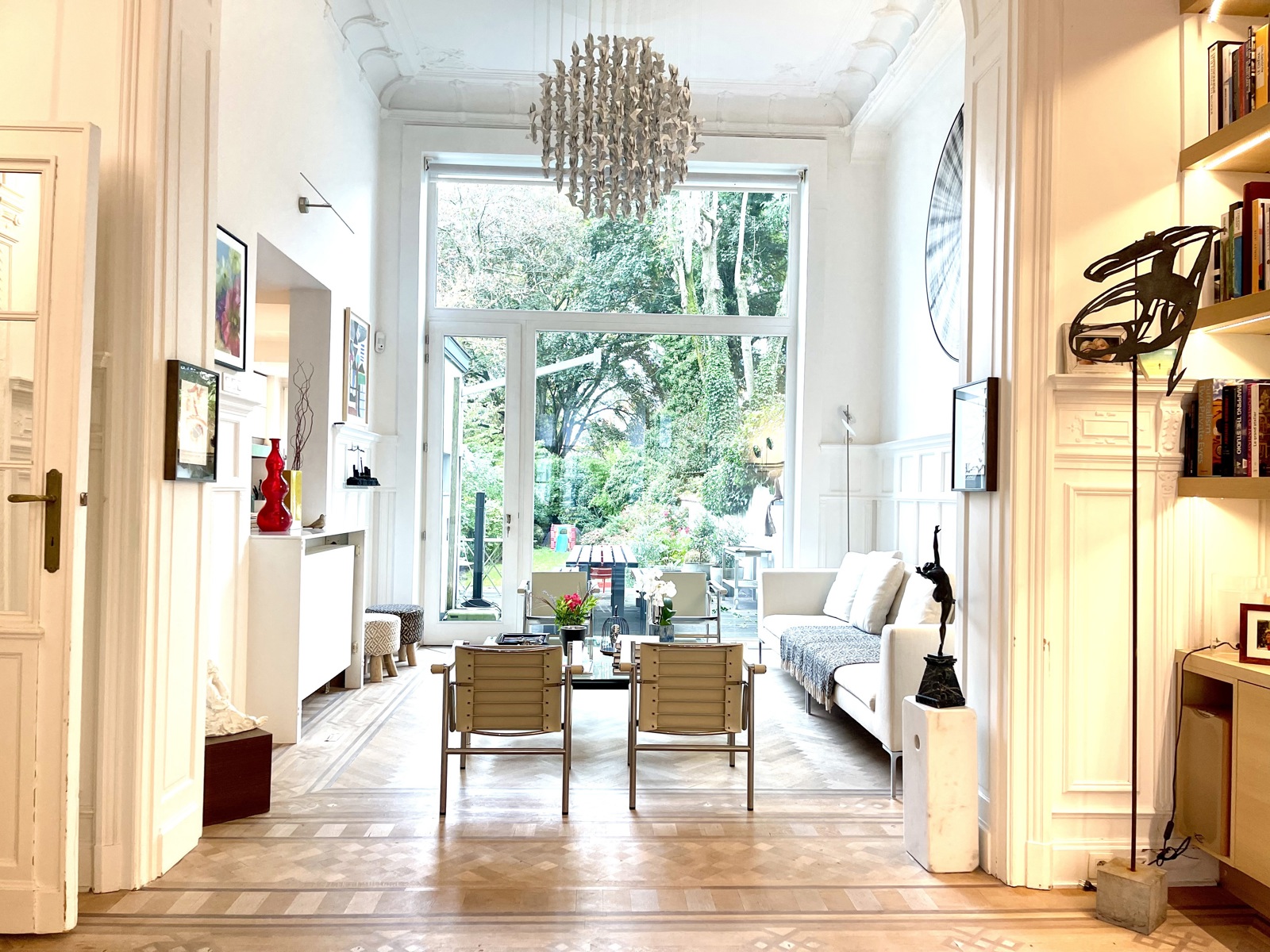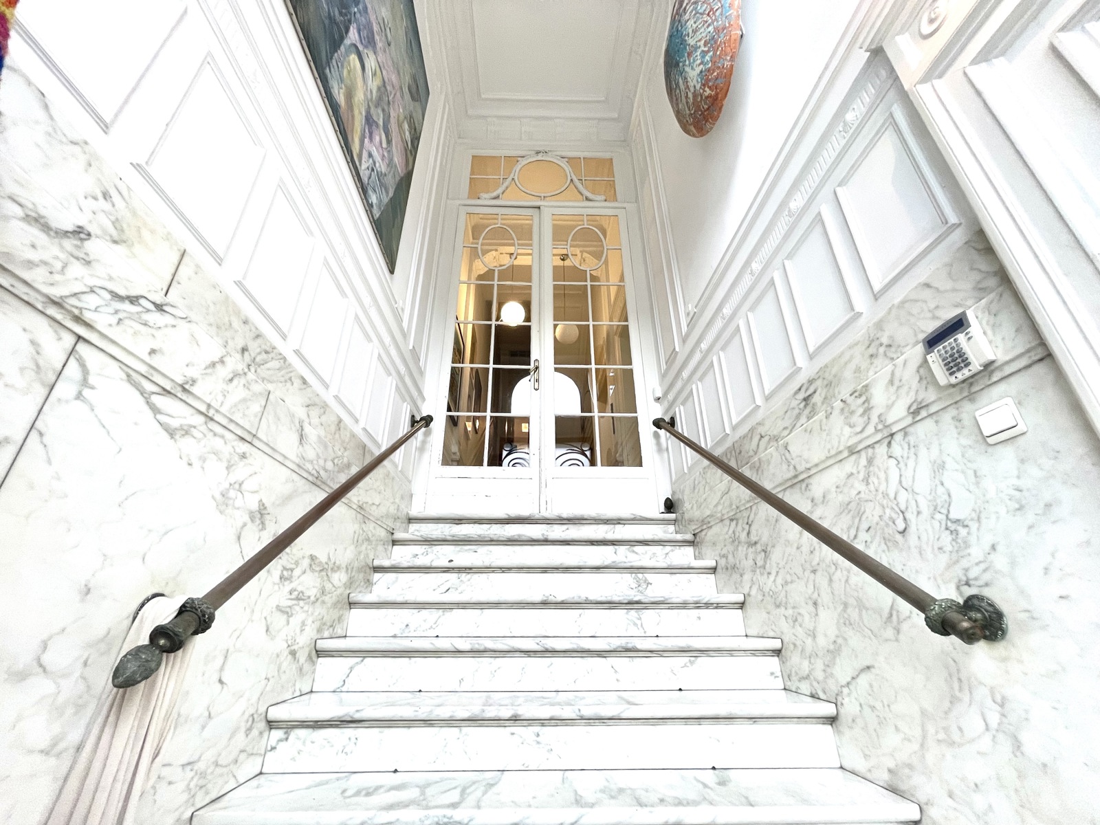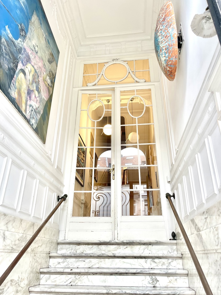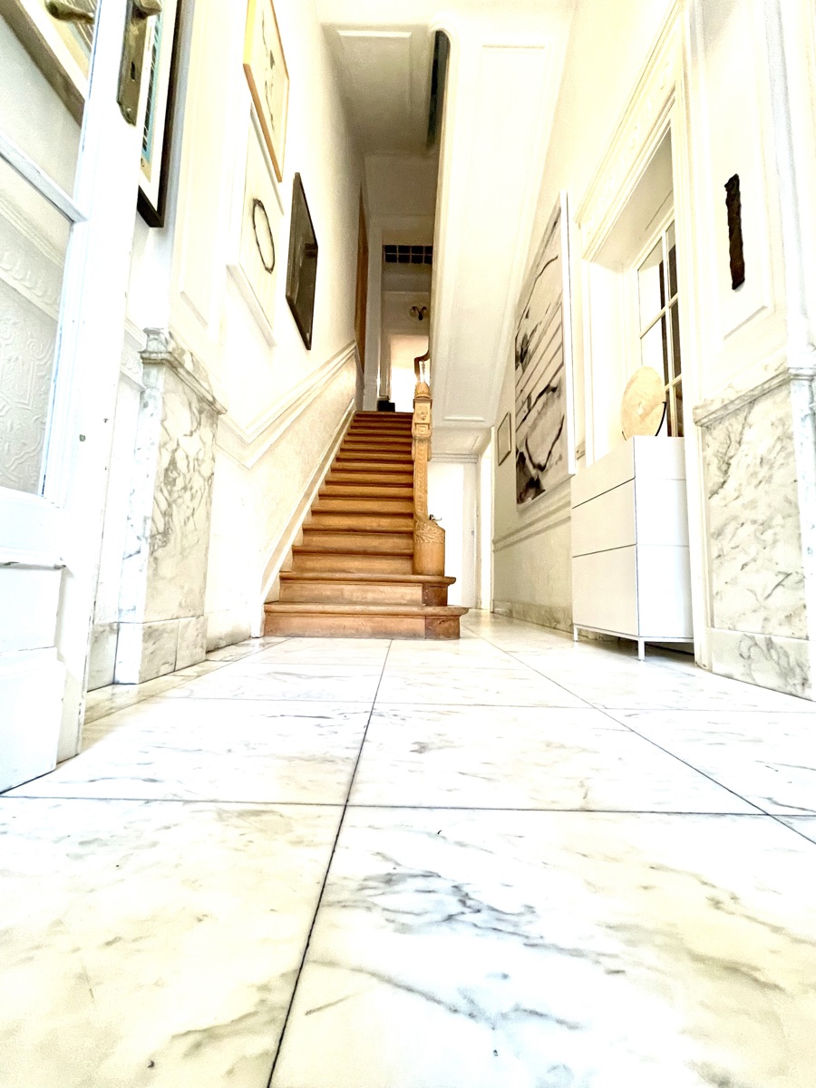 Superbe maison de maître "Beaux Arts" de 1912 idéalement située dans le très prisé quartier d'Ixelles "Brugmann" sur une prestigieuse avenue arborée avec promenade centrale. Elle possède une terrasse et un très beau jardin ainsi qu'un garage. La maison a bénéficié d'une magnifique rénovation de qualité. Actuellement 5 chambres mais possibilité de nombreux changements de par ses 430m2 habitables. Les éléments ornementaux qualifiants une maison de maître d'époque ont été entretenus et magnifiés (parquet chêne, huisseries, plafonds à encorbellements et moulures,cheminées en marbre,,..) Entrée par un bel hall d"entrée en marbre avec une magnifique hauteur sous plafond(moulurés). A ce niveau vous accédez aux 3 grandes pièces inondées de lumiere. Meubles intégrés contemporains en chêne ,bibliothèque etc..Le charme d'antan associé à la modernité et au bon gout en font un coup de coeur prêt à y habiter. Trois grandes pièces en enfilade donnant accès à la large terrasse et au jardin sans vis à vis direct. Egalement une belle cuisine Bulthaup hyper équipée avec électroménagers Miele et ilot de cuissons. Elle benéficie également d'une vue sur le jardin paysagé L'étage suivant est constitué d'un très vaste salon donnant sur l'avenue, de la master room, d'un grand bureau donnant vue sur le jardin ainsi que d'une salle de bain. le dernier étage offre encore 3 chambres, un bureau,parquet chêne, salle de bain. Encore un étage avec deux chambres ainsi qu'un grenier avec mezzanine. Possibilité de mettre en oeuvre un permis accepté en 2016 afin de faire un appartement des deux derniers étages avec terrasse. PEB D Chaudière à condensation récente, alarme, etc